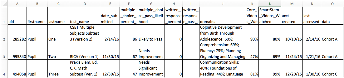 3) If you would like to see who is utilizing their paid prep by looking at the percentage of Smart-STEM Videos watched, you can sort by Column L (SmartStem Videos Watched). These videos teach users how to apply their knowledge to the specific types of questions most likely to appear on the exam.