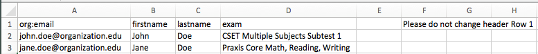 CSV Form: Fill out the Paid Prep CSV form downloadable from our Partner Portal and input each user’s email address, first name, last name, and the specific test/subtest(s) for which you will be purchasing Core Plus Online Prep. Once completed, email the form to OrgSupport@teacherstestprep.com.
